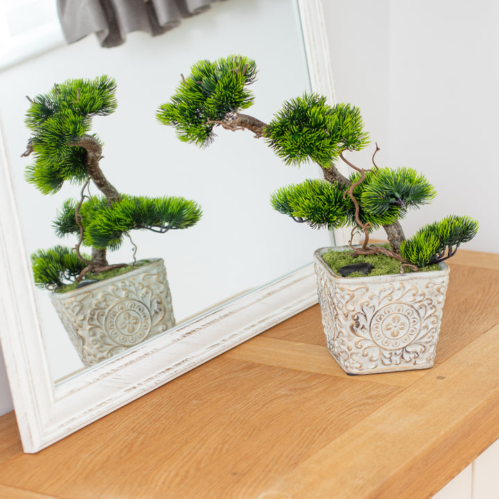 Add a touch of modern elegance to your home or office with this exquisite artificial bonsai tree. The hand-crafted imitation branches and lush green coniferous branches perfectly replicate the aesthetics of a real bonsai tree, but require no maintenance.