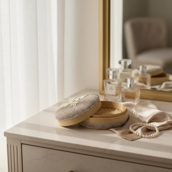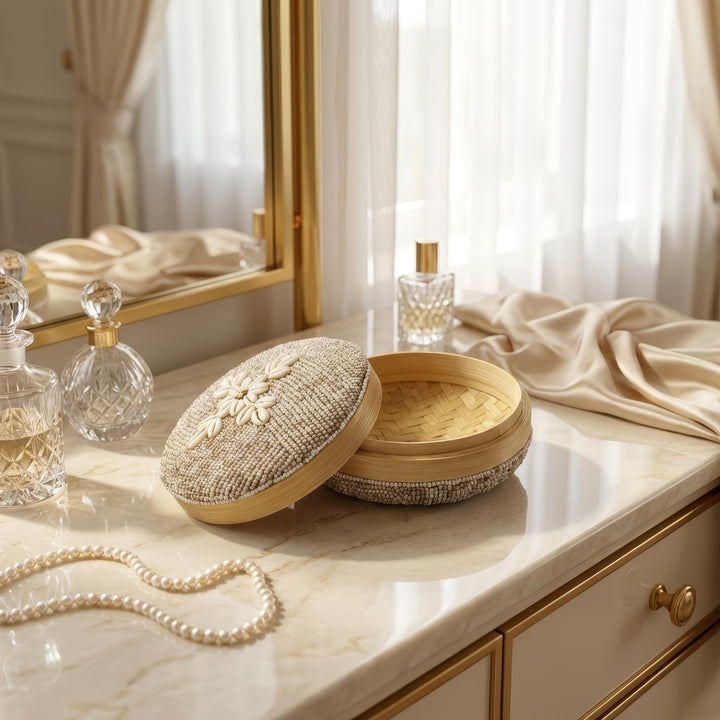 The box is ideal for storing jewelry, accessories, or other small items—whether in the bedroom, bathroom, or beauty space. Its neutral tones easily complement a variety of interior styles, while the round shape adds a sense of warmth and sophistication.