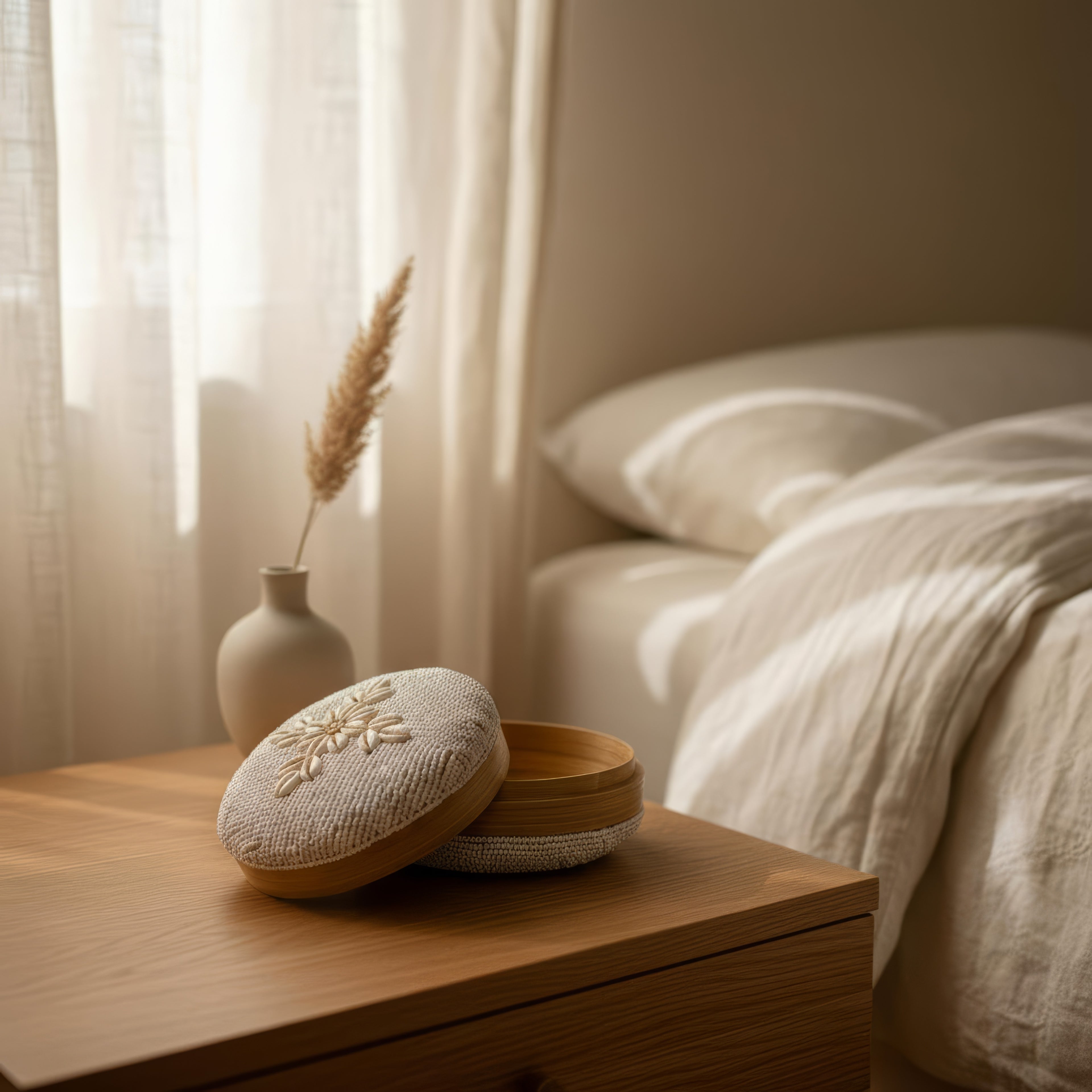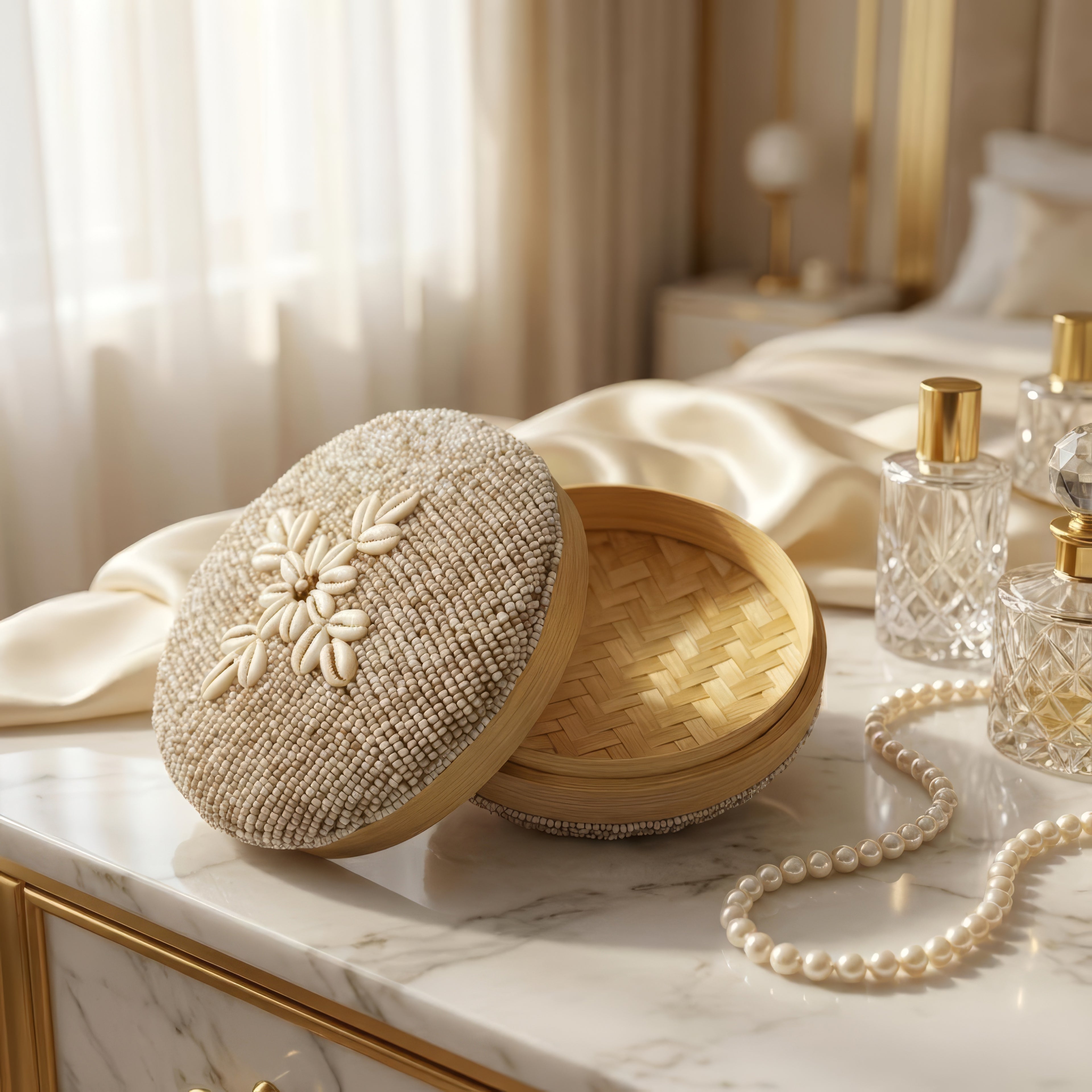 This elegant, handcrafted-style box is a refined blend of subtle luxury and natural beauty, perfectly suited for modern interiors. Made from natural woven materials and adorned with delicate shell details, it stands out for its lightness, texture, and aesthetic harmony.